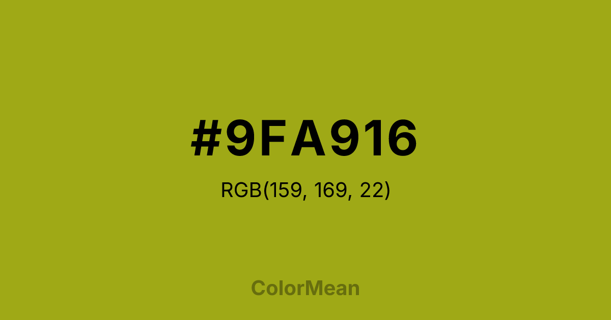 #9FA916 RGB value is (159, 169, 22). The hex color red value is 159, green is 169, and blue is 22. Its HSL format shows a hue of 64°, saturation of 77 percent, and lightness of 37 percent. The CMYK process values are 6 percent, 0 percent, 87 percent, 34 percent.