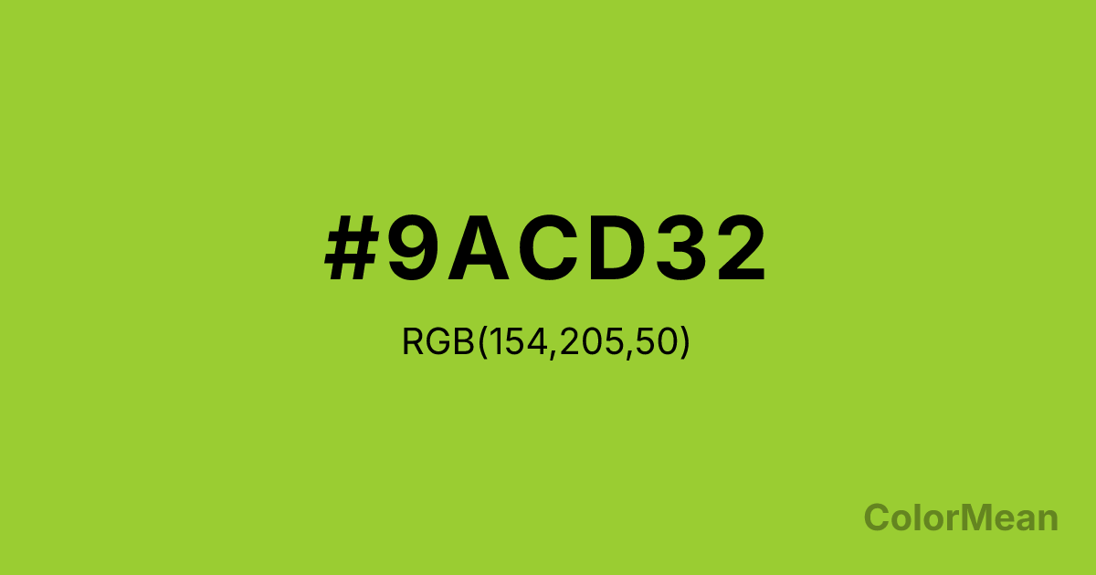 Yellow Green (#9ACD32) RGB value is (154, 205, 50). The hex color red value is 154, green is 205, and blue is 50. Its HSL format shows a hue of 80°, saturation of 61 percent, and lightness of 50 percent. The CMYK process values are 25 percent, 0 percent, 76 percent, 20 percent.