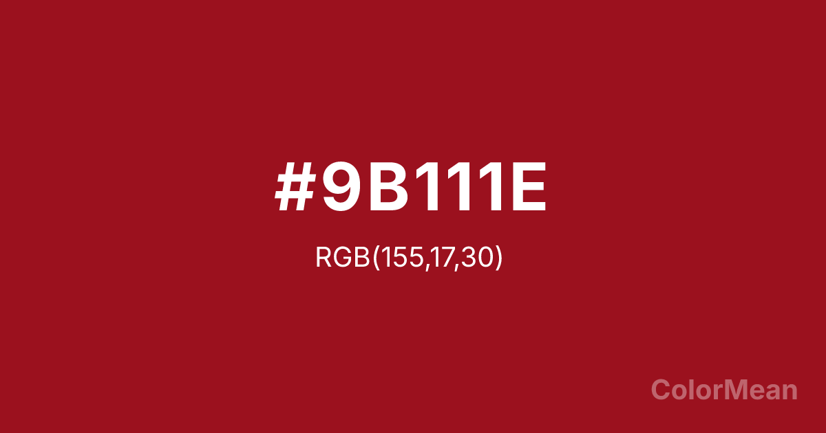 Ruby Red (#9B111E) RGB value is (155, 17, 30). The hex color red value is 155, green is 17, and blue is 30. Its HSL format shows a hue of 354°, saturation of 80 percent, and lightness of 34 percent. The CMYK process values are 0 percent, 89 percent, 81 percent, 39 percent.