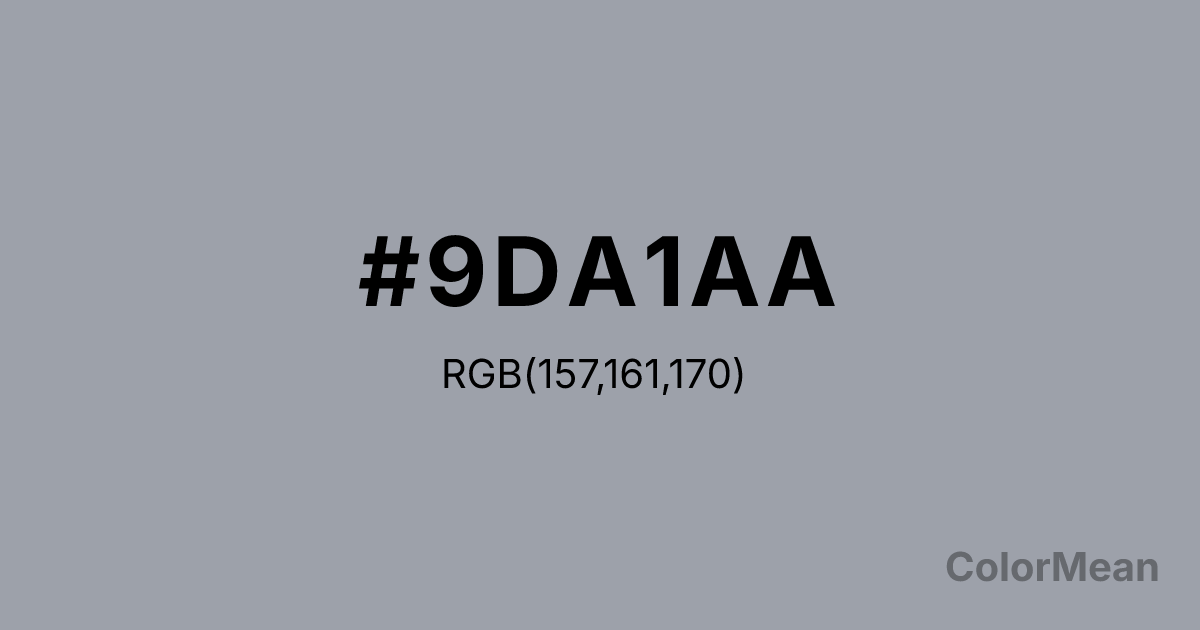Window Grey (#9DA1AA) RGB value is (157, 161, 170). The hex color red value is 157, green is 161, and blue is 170. Its HSL format shows a hue of 222°, saturation of 7 percent, and lightness of 64 percent. The CMYK process values are 8 percent, 5 percent, 0 percent, 33 percent.