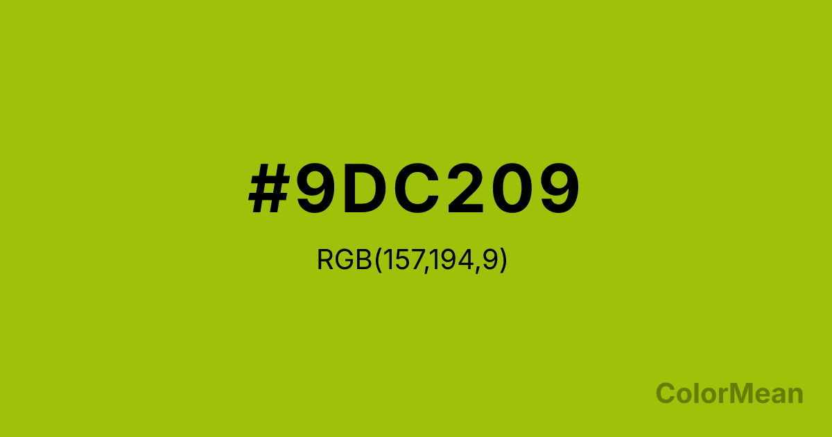 Limerick (#9DC209) RGB value is (157, 194, 9). The hex color red value is 157, green is 194, and blue is 9. Its HSL format shows a hue of 72°, saturation of 91 percent, and lightness of 40 percent. The CMYK process values are 19 percent, 0 percent, 95 percent, 24 percent.