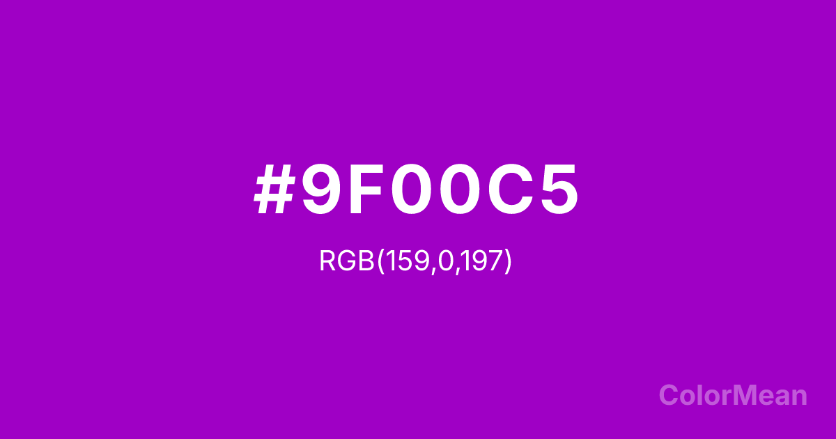 Purple (Munsell) (#9F00C5) RGB value is (159, 0, 197). The hex color red value is 159, green is 0, and blue is 197. Its HSL format shows a hue of 288°, saturation of 100 percent, and lightness of 39 percent. The CMYK process values are 19 percent, 100 percent, 0 percent, 23 percent.
