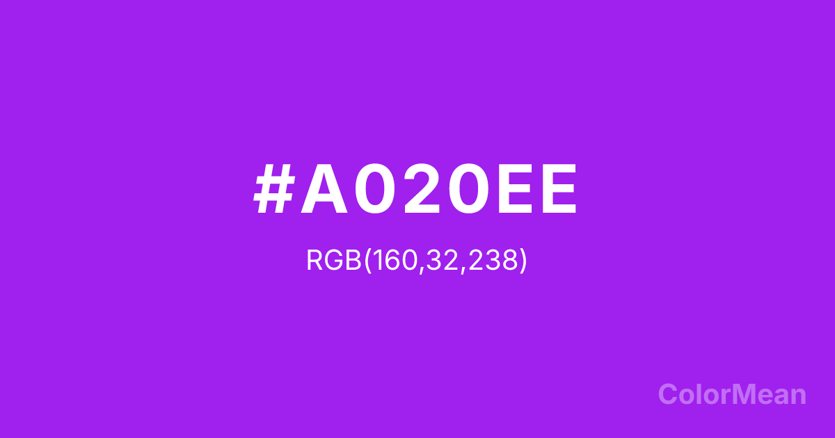 #A020EE RGB value is (160, 32, 238). The hex color red value is 160, green is 32, and blue is 238. Its HSL format shows a hue of 277°, saturation of 86 percent, and lightness of 53 percent. The CMYK process values are 33 percent, 87 percent, 0 percent, 7 percent.