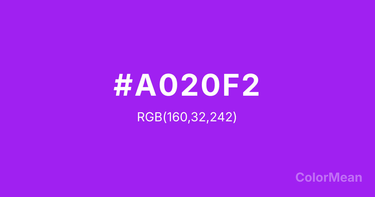 #A020F2 RGB value is (160, 32, 242). The hex color red value is 160, green is 32, and blue is 242. Its HSL format shows a hue of 277°, saturation of 89 percent, and lightness of 54 percent. The CMYK process values are 34 percent, 87 percent, 0 percent, 5 percent.