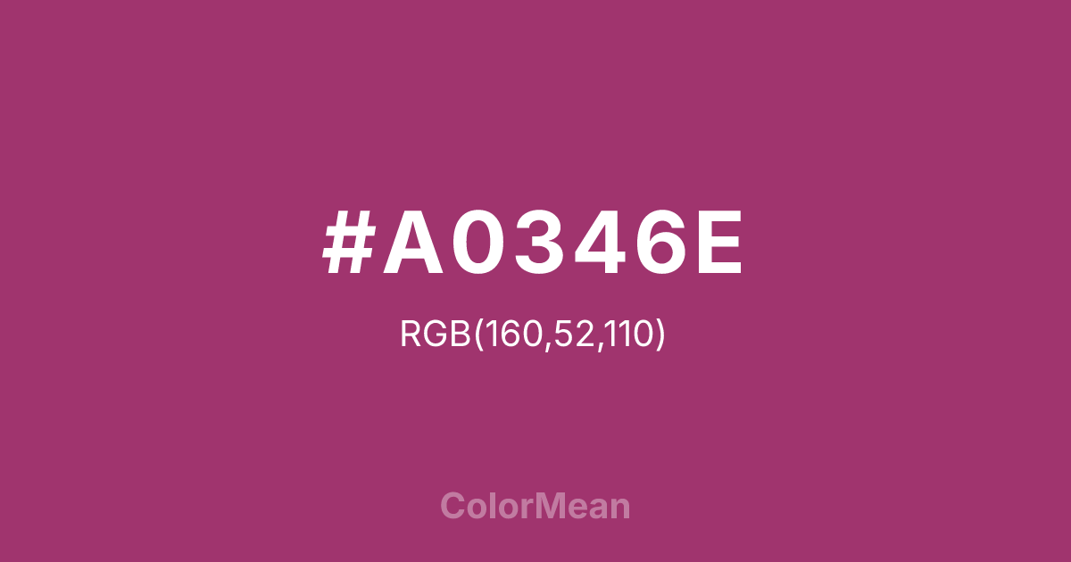 #A0346E RGB value is (160, 52, 110). The hex color red value is 160, green is 52, and blue is 110. Its HSL format shows a hue of 328°, saturation of 51 percent, and lightness of 42 percent. The CMYK process values are 0 percent, 68 percent, 31 percent, 37 percent.