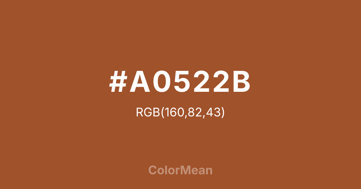 #A0522B RGB value is (160, 82, 43). The hex color red value is 160, green is 82, and blue is 43. Its HSL format shows a hue of 20°, saturation of 58 percent, and lightness of 40 percent. The CMYK process values are 0 percent, 49 percent, 73 percent, 37 percent.