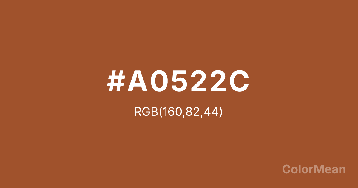 #A0522C RGB value is (160, 82, 44). The hex color red value is 160, green is 82, and blue is 44. Its HSL format shows a hue of 20°, saturation of 57 percent, and lightness of 40 percent. The CMYK process values are 0 percent, 49 percent, 72 percent, 37 percent.