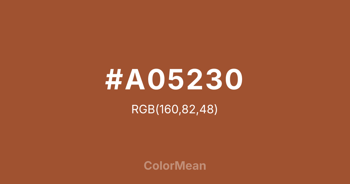 #A05230 RGB value is (160, 82, 48). The hex color red value is 160, green is 82, and blue is 48. Its HSL format shows a hue of 18°, saturation of 54 percent, and lightness of 41 percent. The CMYK process values are 0 percent, 49 percent, 70 percent, 37 percent.
