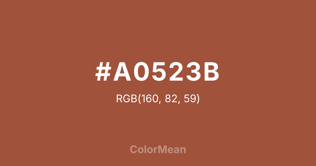 #A0523B RGB value is (160, 82, 59). The hex color red value is 160, green is 82, and blue is 59. Its HSL format shows a hue of 14°, saturation of 46 percent, and lightness of 43 percent. The CMYK process values are 0 percent, 49 percent, 63 percent, 37 percent.