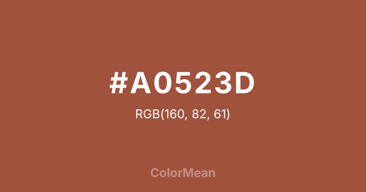 #A0523D RGB value is (160, 82, 61). The hex color red value is 160, green is 82, and blue is 61. Its HSL format shows a hue of 13°, saturation of 45 percent, and lightness of 43 percent. The CMYK process values are 0 percent, 49 percent, 62 percent, 37 percent.
