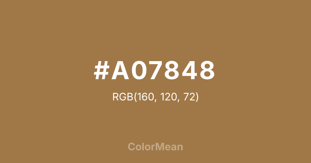 #A07848 RGB value is (160, 120, 72). The hex color red value is 160, green is 120, and blue is 72. Its HSL format shows a hue of 33°, saturation of 38 percent, and lightness of 45 percent. The CMYK process values are 0 percent, 25 percent, 55 percent, 37 percent.