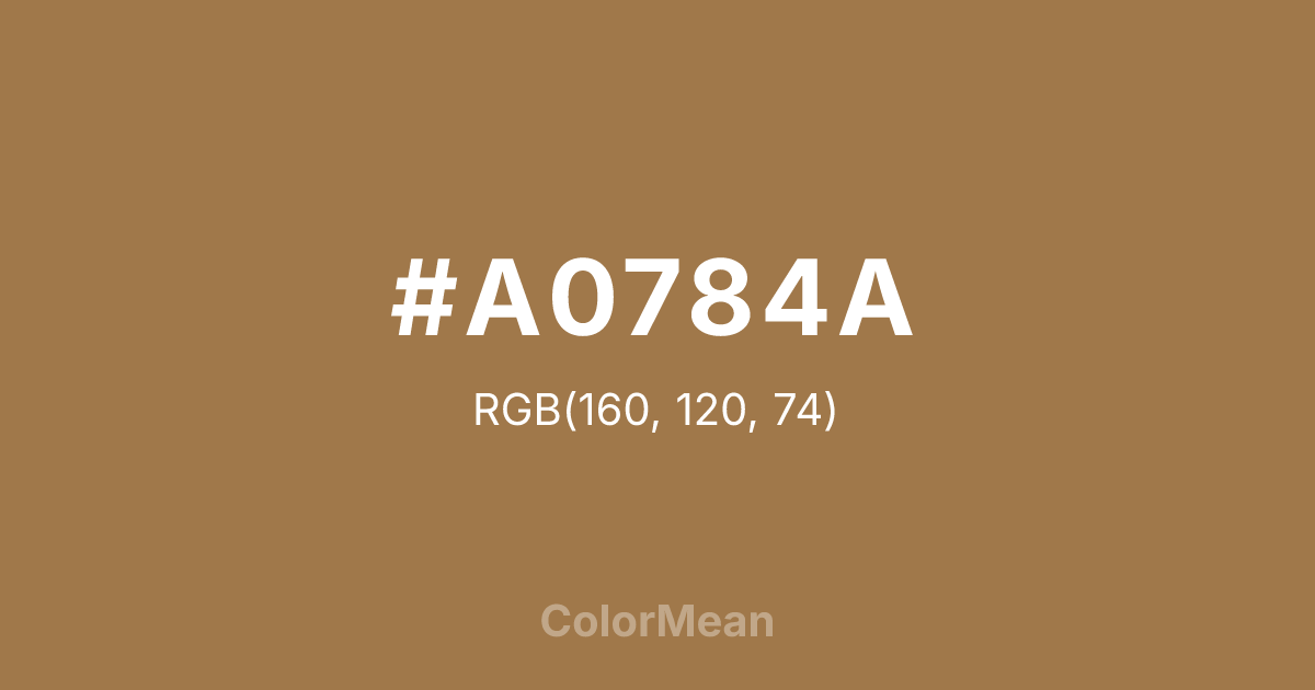 #A0784A RGB value is (160, 120, 74). The hex color red value is 160, green is 120, and blue is 74. Its HSL format shows a hue of 32°, saturation of 37 percent, and lightness of 46 percent. The CMYK process values are 0 percent, 25 percent, 54 percent, 37 percent.