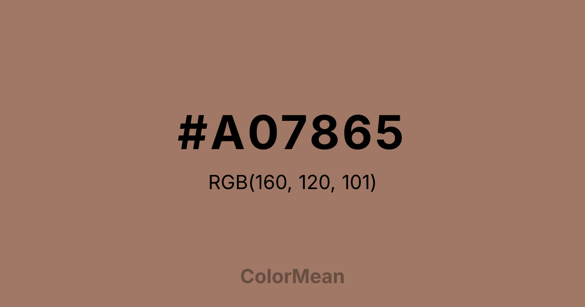 #A07865 RGB value is (160, 120, 101). The hex color red value is 160, green is 120, and blue is 101. Its HSL format shows a hue of 19°, saturation of 24 percent, and lightness of 51 percent. The CMYK process values are 0 percent, 25 percent, 37 percent, 37 percent.
