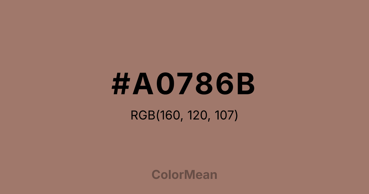 #A0786B RGB value is (160, 120, 107). The hex color red value is 160, green is 120, and blue is 107. Its HSL format shows a hue of 15°, saturation of 22 percent, and lightness of 52 percent. The CMYK process values are 0 percent, 25 percent, 33 percent, 37 percent.