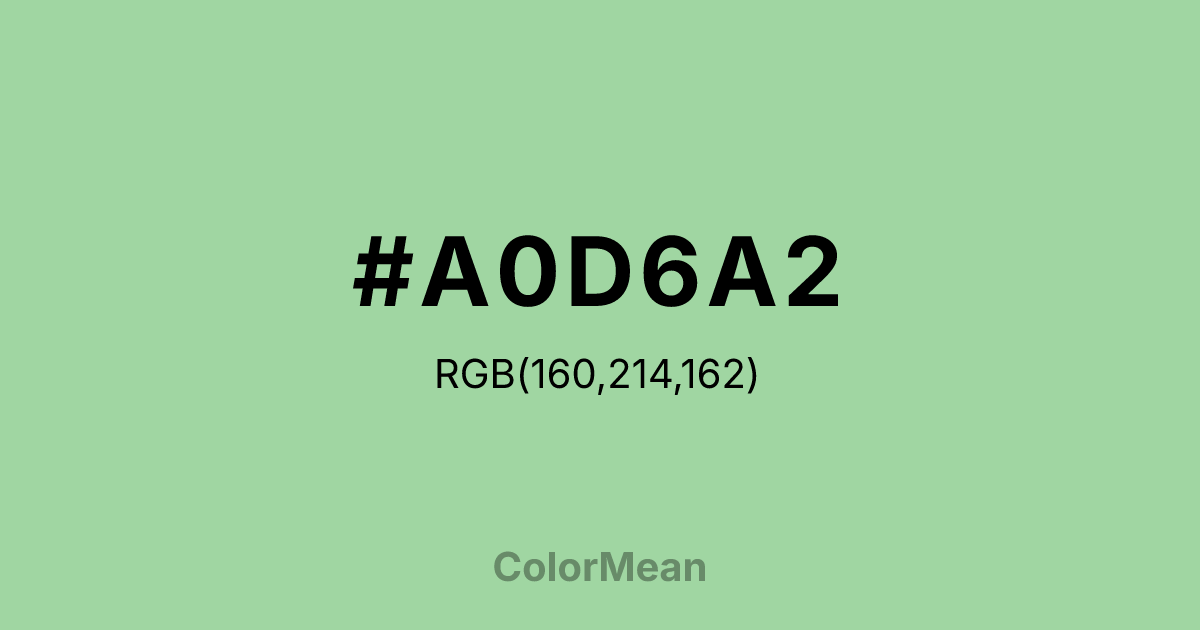 #A0D6A2 RGB value is (160, 214, 162). The hex color red value is 160, green is 214, and blue is 162. Its HSL format shows a hue of 122°, saturation of 40 percent, and lightness of 73 percent. The CMYK process values are 25 percent, 0 percent, 24 percent, 16 percent.