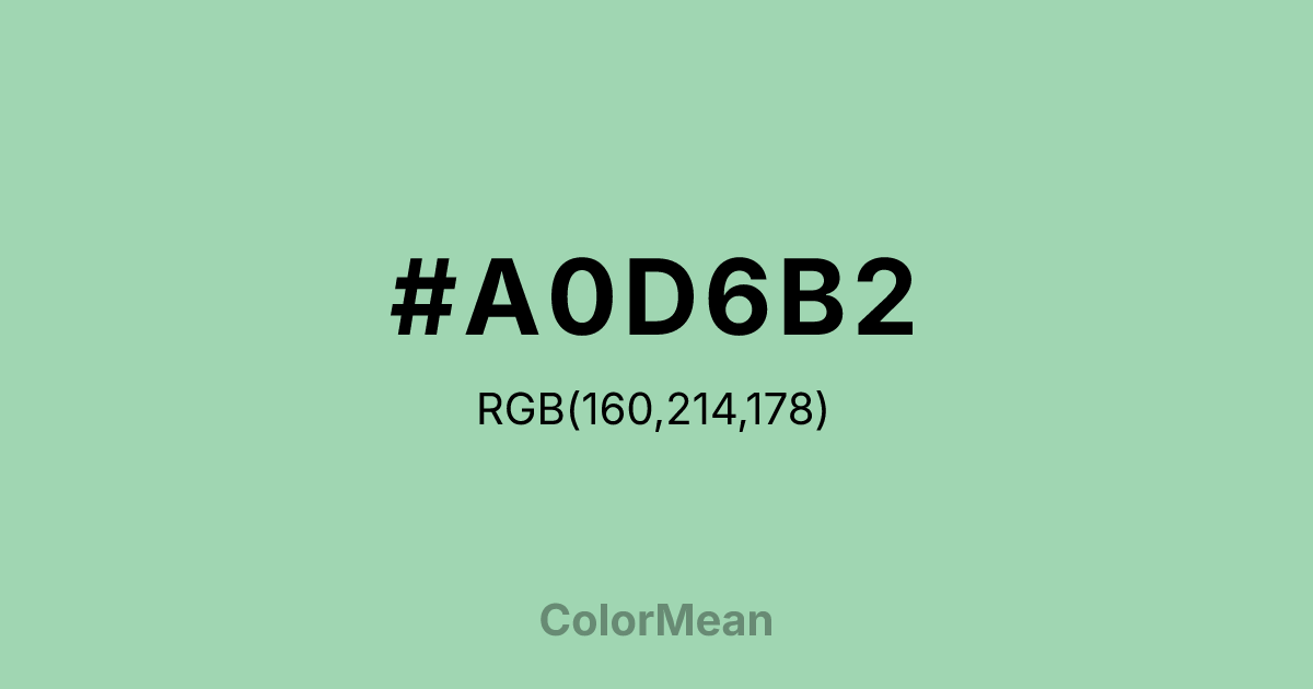 #A0D6B2 RGB value is (160, 214, 178). The hex color red value is 160, green is 214, and blue is 178. Its HSL format shows a hue of 140°, saturation of 40 percent, and lightness of 73 percent. The CMYK process values are 25 percent, 0 percent, 17 percent, 16 percent.