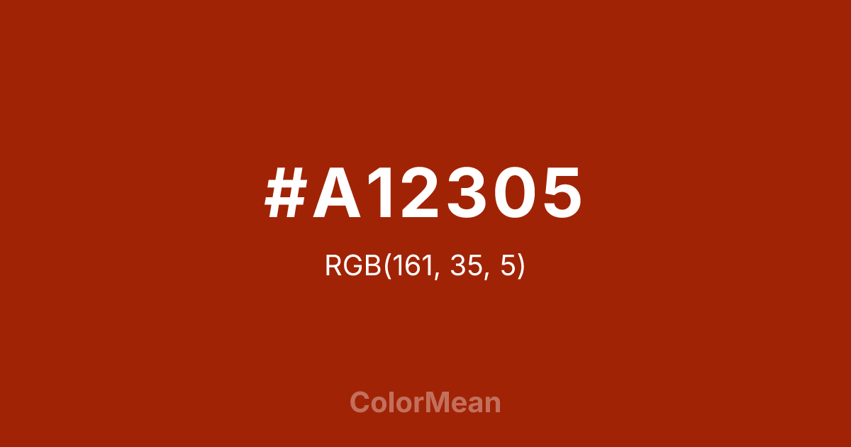 #A12305 RGB value is (161, 35, 5). The hex color red value is 161, green is 35, and blue is 5. Its HSL format shows a hue of 12°, saturation of 94 percent, and lightness of 33 percent. The CMYK process values are 0 percent, 78 percent, 97 percent, 37 percent.