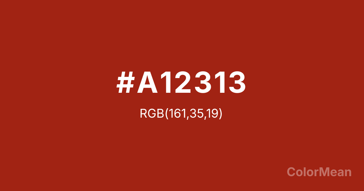#A12313 RGB value is (161, 35, 19). The hex color red value is 161, green is 35, and blue is 19. Its HSL format shows a hue of 7°, saturation of 79 percent, and lightness of 35 percent. The CMYK process values are 0 percent, 78 percent, 88 percent, 37 percent.