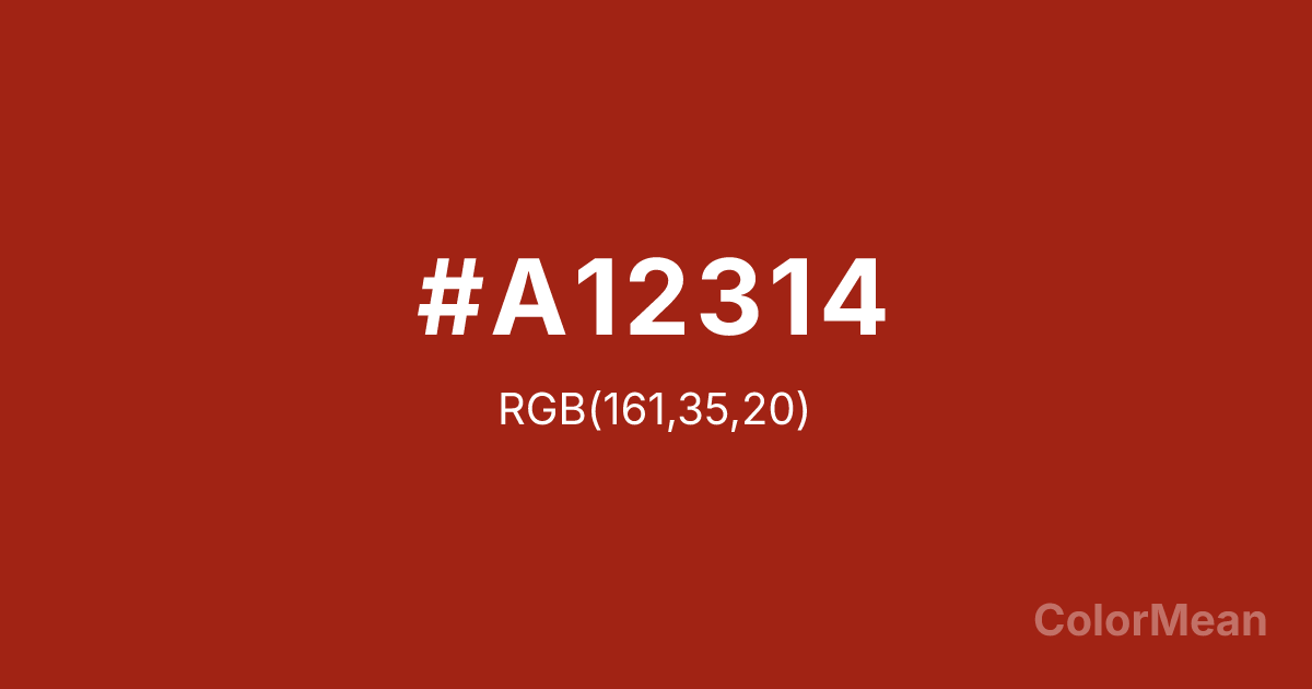 #A12314 RGB value is (161, 35, 20). The hex color red value is 161, green is 35, and blue is 20. Its HSL format shows a hue of 6°, saturation of 78 percent, and lightness of 35 percent. The CMYK process values are 0 percent, 78 percent, 88 percent, 37 percent.