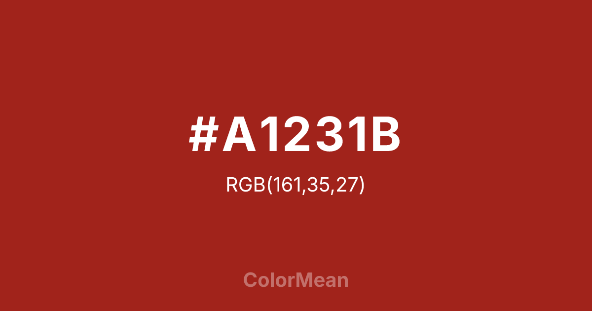#A1231B RGB value is (161, 35, 27). The hex color red value is 161, green is 35, and blue is 27. Its HSL format shows a hue of 4°, saturation of 71 percent, and lightness of 37 percent. The CMYK process values are 0 percent, 78 percent, 83 percent, 37 percent.