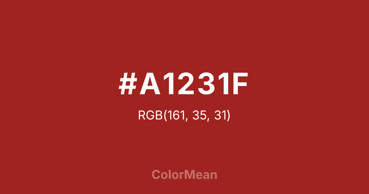 #A1231F RGB value is (161, 35, 31). The hex color red value is 161, green is 35, and blue is 31. Its HSL format shows a hue of 2°, saturation of 68 percent, and lightness of 38 percent. The CMYK process values are 0 percent, 78 percent, 81 percent, 37 percent.
