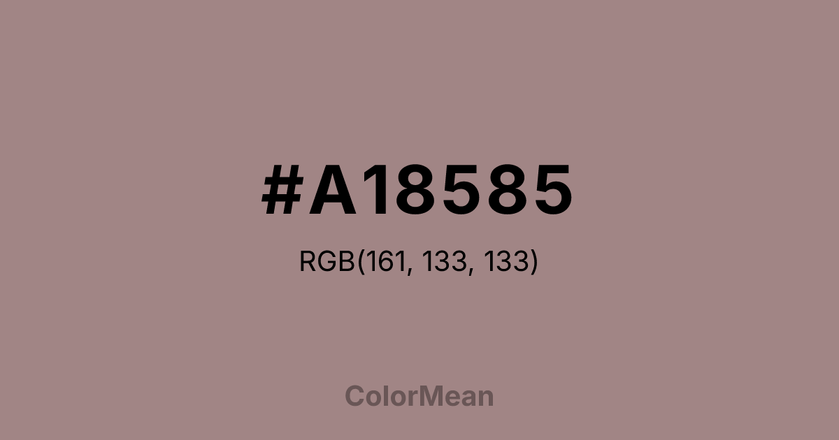 #A18585 RGB value is (161, 133, 133). The hex color red value is 161, green is 133, and blue is 133. Its HSL format shows a hue of 0°, saturation of 13 percent, and lightness of 58 percent. The CMYK process values are 0 percent, 17 percent, 17 percent, 37 percent.