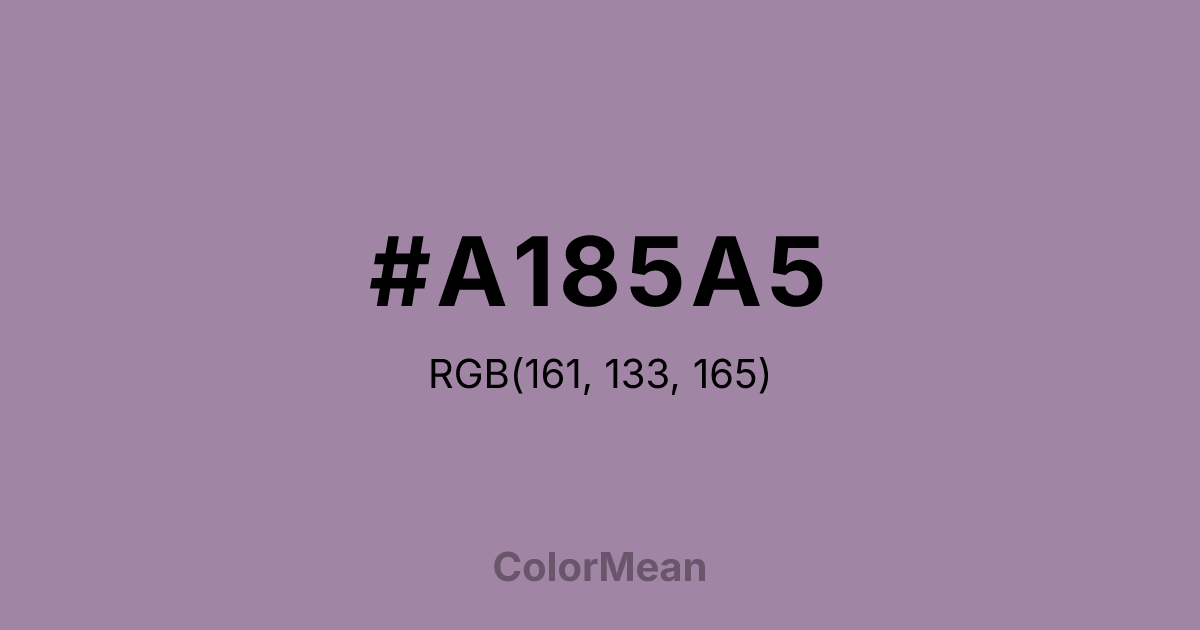 #A185A5 RGB value is (161, 133, 165). The hex color red value is 161, green is 133, and blue is 165. Its HSL format shows a hue of 293°, saturation of 15 percent, and lightness of 58 percent. The CMYK process values are 2 percent, 19 percent, 0 percent, 35 percent.