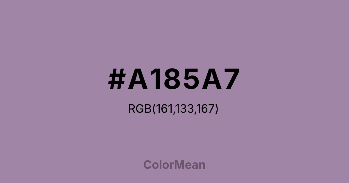 #A185A7 RGB value is (161, 133, 167). The hex color red value is 161, green is 133, and blue is 167. Its HSL format shows a hue of 289°, saturation of 16 percent, and lightness of 59 percent. The CMYK process values are 4 percent, 20 percent, 0 percent, 35 percent.