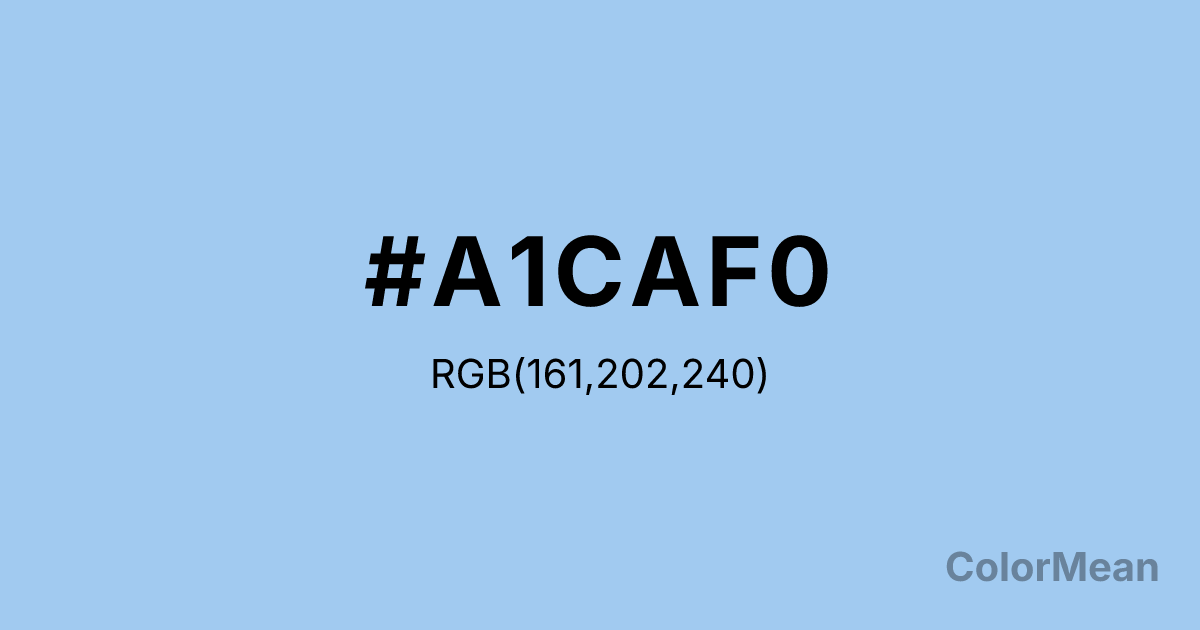 #A1CAF0 RGB value is (161, 202, 240). The hex color red value is 161, green is 202, and blue is 240. Its HSL format shows a hue of 209°, saturation of 72 percent, and lightness of 79 percent. The CMYK process values are 33 percent, 16 percent, 0 percent, 6 percent.