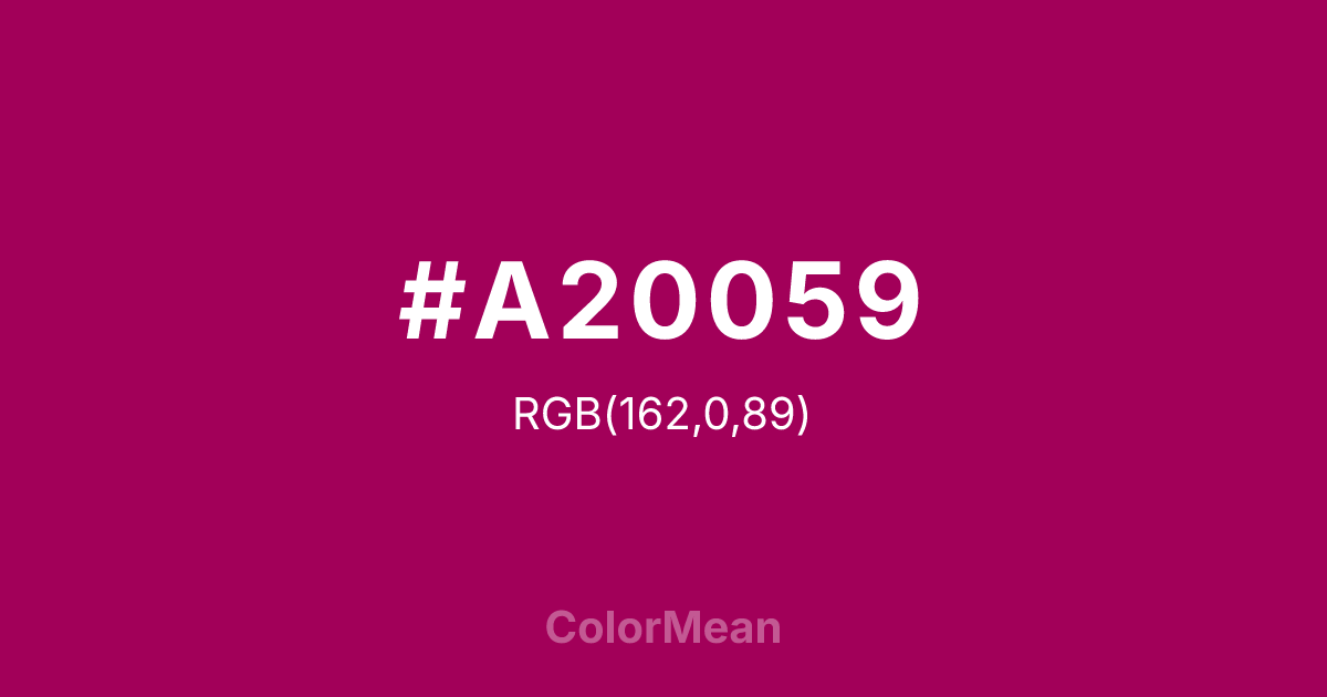 #A20059 RGB value is (162, 0, 89). The hex color red value is 162, green is 0, and blue is 89. Its HSL format shows a hue of 327°, saturation of 100 percent, and lightness of 32 percent. The CMYK process values are 0 percent, 100 percent, 45 percent, 36 percent.