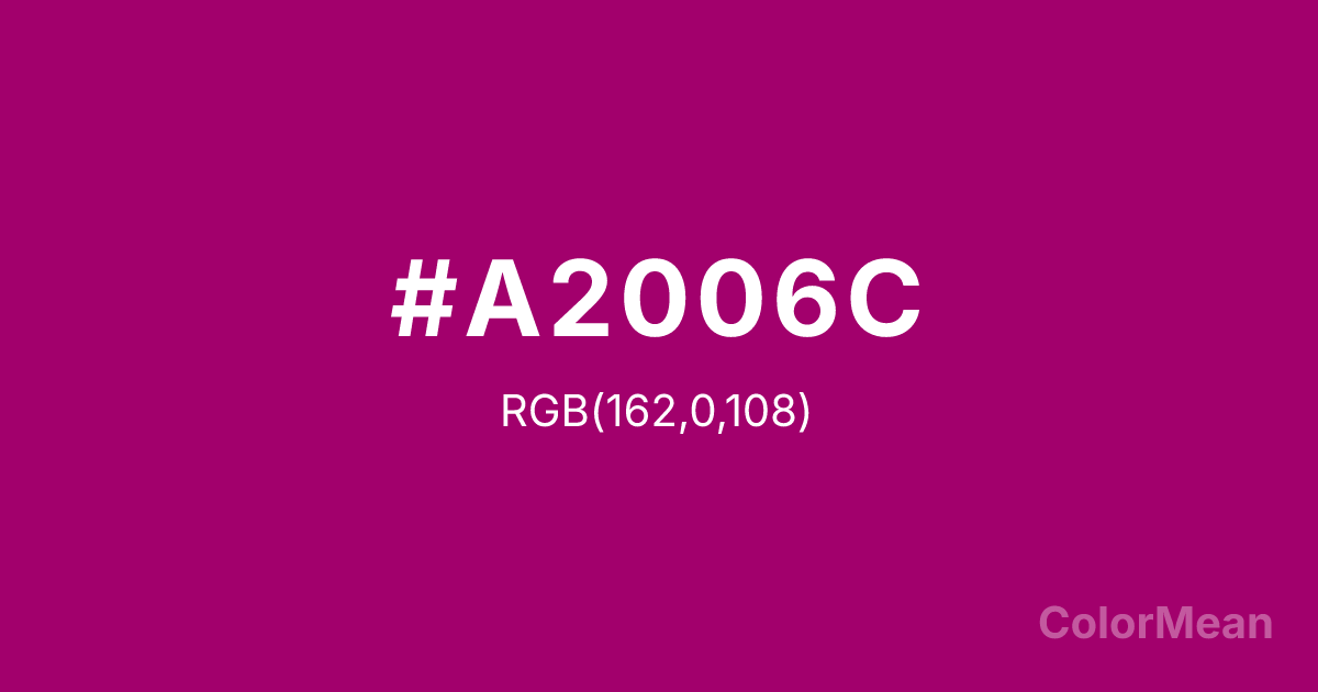 #A2006C RGB value is (162, 0, 108). The hex color red value is 162, green is 0, and blue is 108. Its HSL format shows a hue of 320°, saturation of 100 percent, and lightness of 32 percent. The CMYK process values are 0 percent, 100 percent, 33 percent, 36 percent.