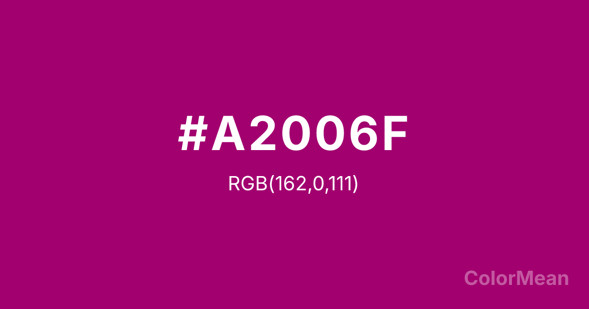 #A2006F RGB value is (162, 0, 111). The hex color red value is 162, green is 0, and blue is 111. Its HSL format shows a hue of 319°, saturation of 100 percent, and lightness of 32 percent. The CMYK process values are 0 percent, 100 percent, 31 percent, 36 percent.