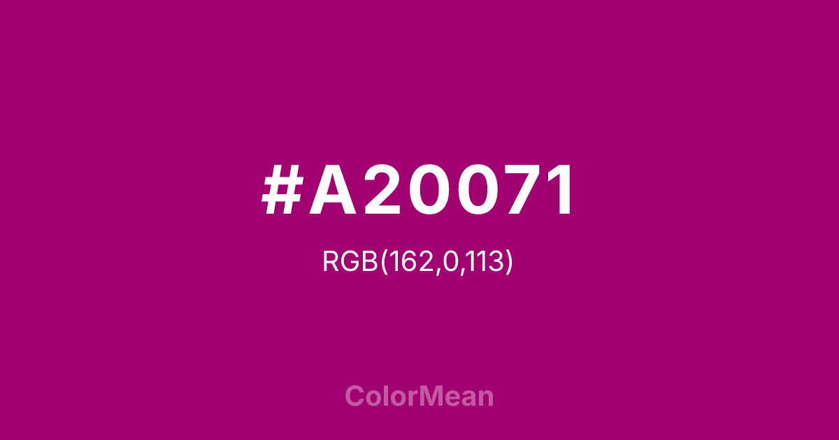 #A20071 RGB value is (162, 0, 113). The hex color red value is 162, green is 0, and blue is 113. Its HSL format shows a hue of 318°, saturation of 100 percent, and lightness of 32 percent. The CMYK process values are 0 percent, 100 percent, 30 percent, 36 percent.