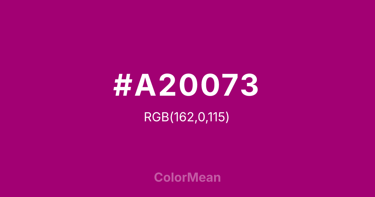 #A20073 RGB value is (162, 0, 115). The hex color red value is 162, green is 0, and blue is 115. Its HSL format shows a hue of 317°, saturation of 100 percent, and lightness of 32 percent. The CMYK process values are 0 percent, 100 percent, 29 percent, 36 percent.