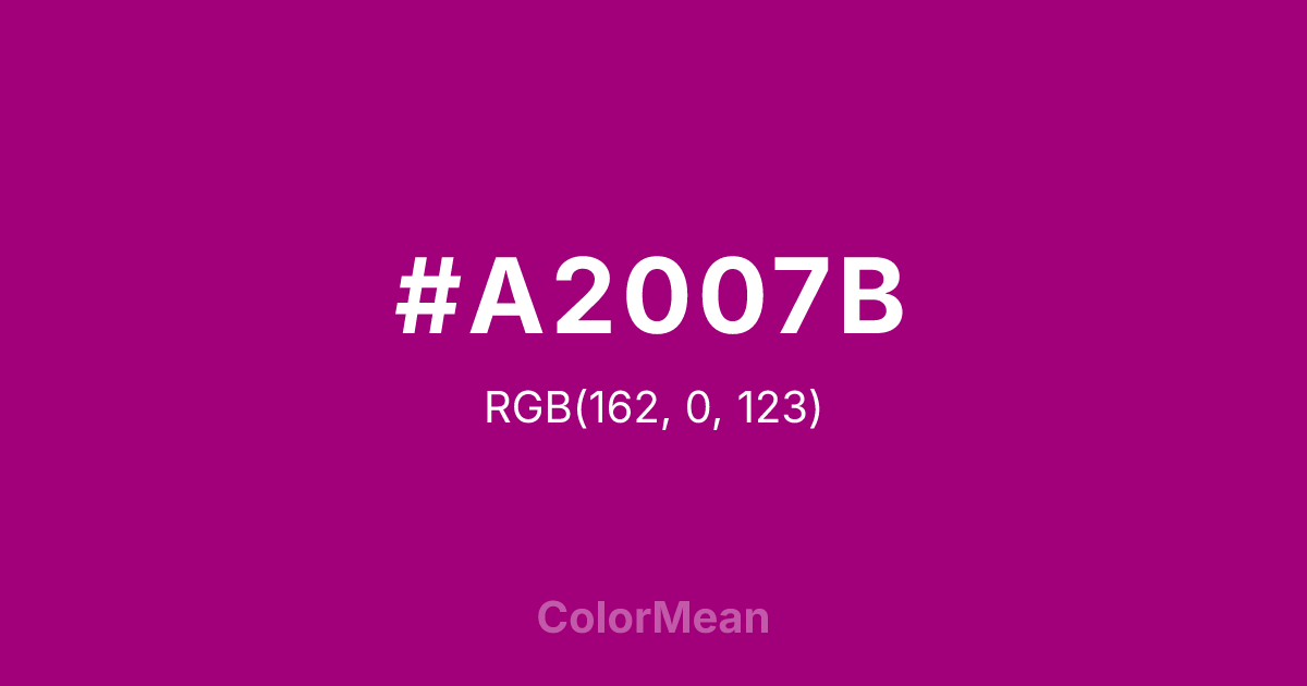 #A2007B RGB value is (162, 0, 123). The hex color red value is 162, green is 0, and blue is 123. Its HSL format shows a hue of 314°, saturation of 100 percent, and lightness of 32 percent. The CMYK process values are 0 percent, 100 percent, 24 percent, 36 percent.