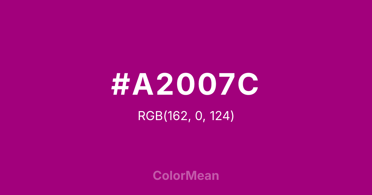 #A2007C RGB value is (162, 0, 124). The hex color red value is 162, green is 0, and blue is 124. Its HSL format shows a hue of 314°, saturation of 100 percent, and lightness of 32 percent. The CMYK process values are 0 percent, 100 percent, 23 percent, 36 percent.