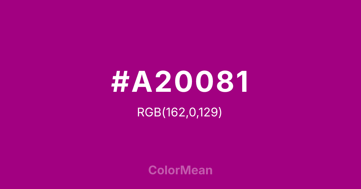 #A20081 RGB value is (162, 0, 129). The hex color red value is 162, green is 0, and blue is 129. Its HSL format shows a hue of 312°, saturation of 100 percent, and lightness of 32 percent. The CMYK process values are 0 percent, 100 percent, 20 percent, 36 percent.