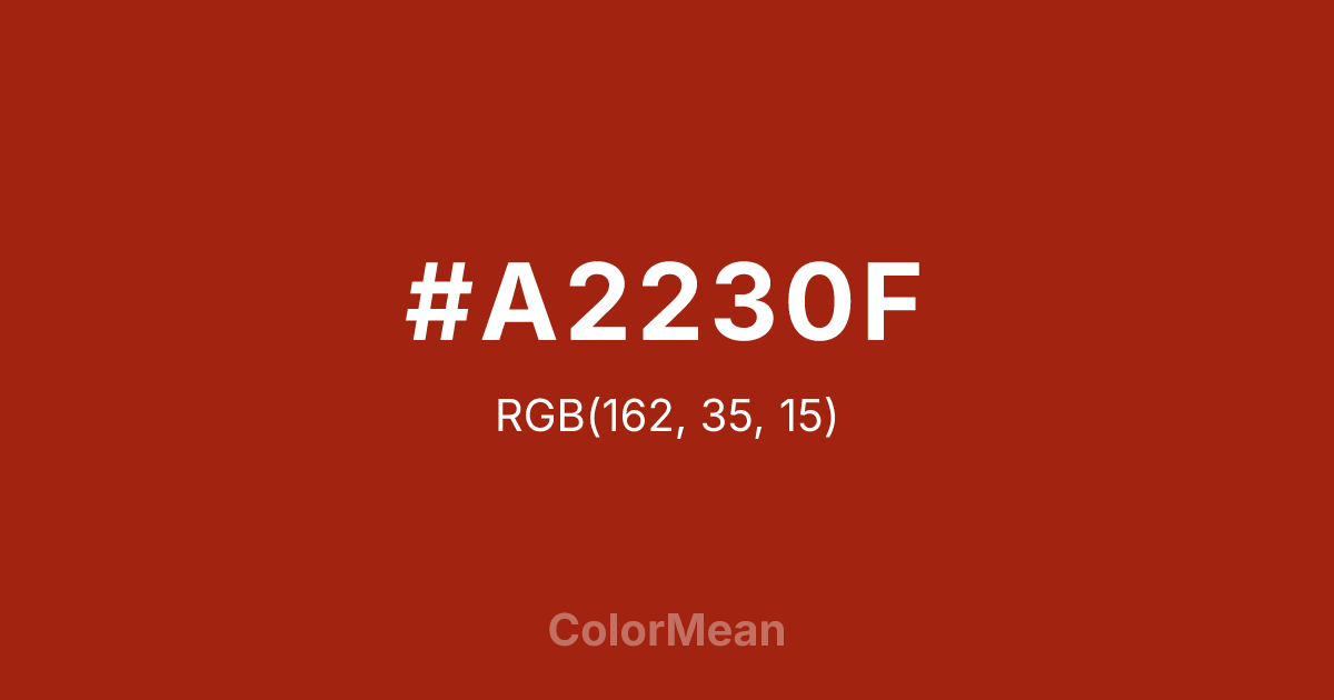 #A2230F RGB value is (162, 35, 15). The hex color red value is 162, green is 35, and blue is 15. Its HSL format shows a hue of 8°, saturation of 83 percent, and lightness of 35 percent. The CMYK process values are 0 percent, 78 percent, 91 percent, 36 percent.