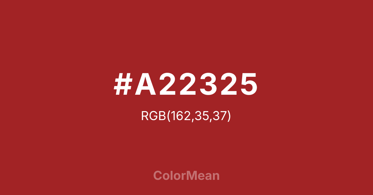 #A22325 RGB value is (162, 35, 37). The hex color red value is 162, green is 35, and blue is 37. Its HSL format shows a hue of 359°, saturation of 64 percent, and lightness of 39 percent. The CMYK process values are 0 percent, 78 percent, 77 percent, 36 percent.