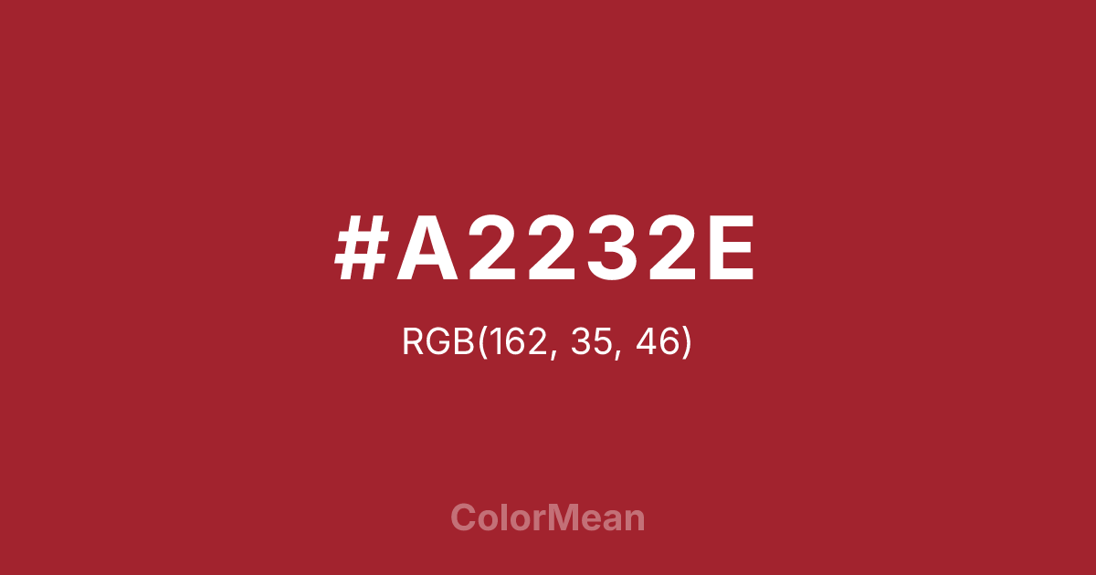 #A2232E RGB value is (162, 35, 46). The hex color red value is 162, green is 35, and blue is 46. Its HSL format shows a hue of 355°, saturation of 64 percent, and lightness of 39 percent. The CMYK process values are 0 percent, 78 percent, 72 percent, 36 percent.