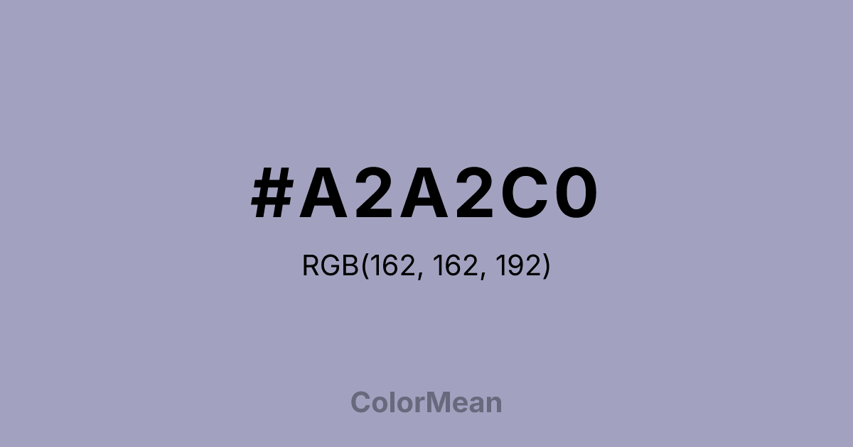 #A2A2C0 RGB value is (162, 162, 192). The hex color red value is 162, green is 162, and blue is 192. Its HSL format shows a hue of 240°, saturation of 19 percent, and lightness of 69 percent. The CMYK process values are 16 percent, 16 percent, 0 percent, 25 percent.