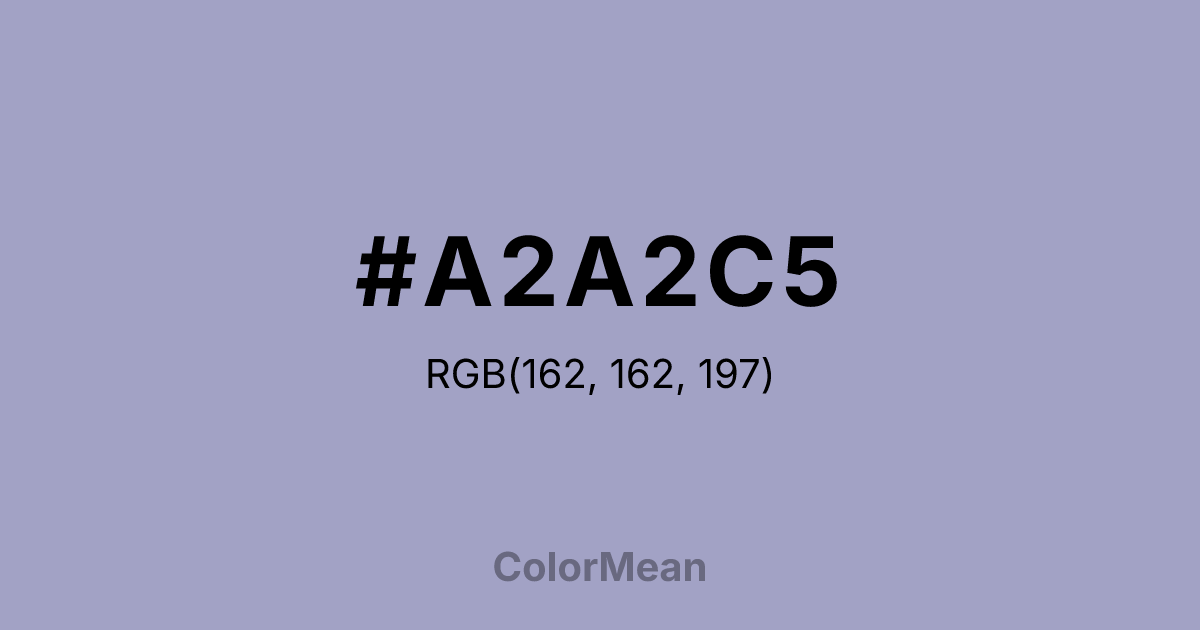 #A2A2C5 RGB value is (162, 162, 197). The hex color red value is 162, green is 162, and blue is 197. Its HSL format shows a hue of 240°, saturation of 23 percent, and lightness of 70 percent. The CMYK process values are 18 percent, 18 percent, 0 percent, 23 percent.