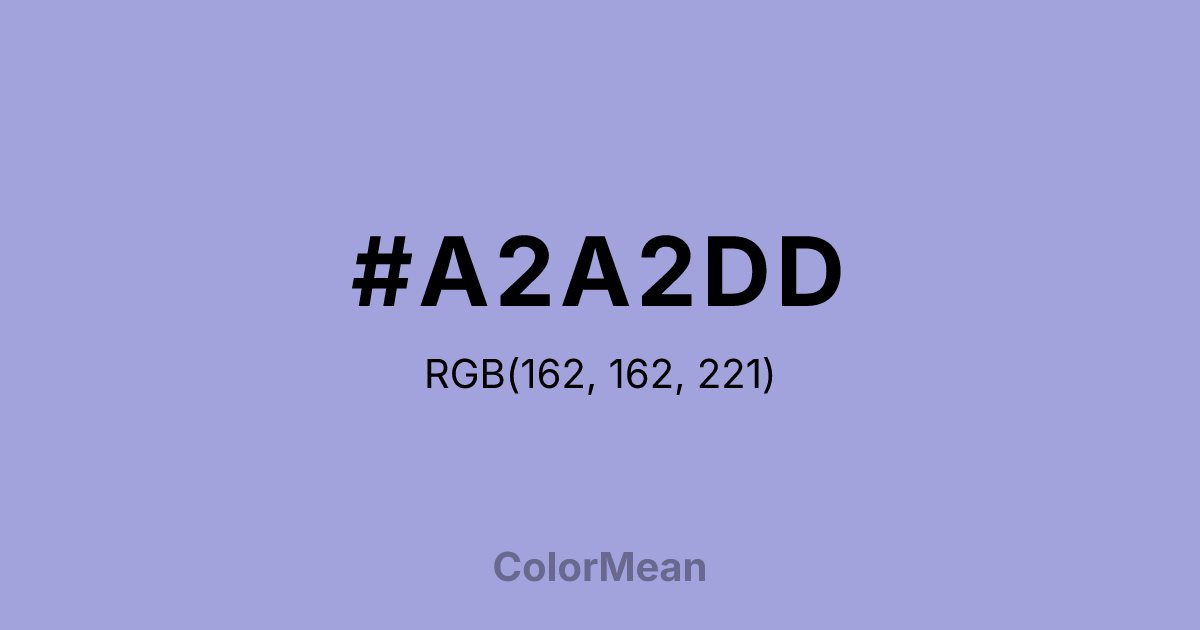 #A2A2DD RGB value is (162, 162, 221). The hex color red value is 162, green is 162, and blue is 221. Its HSL format shows a hue of 240°, saturation of 46 percent, and lightness of 75 percent. The CMYK process values are 27 percent, 27 percent, 0 percent, 13 percent.