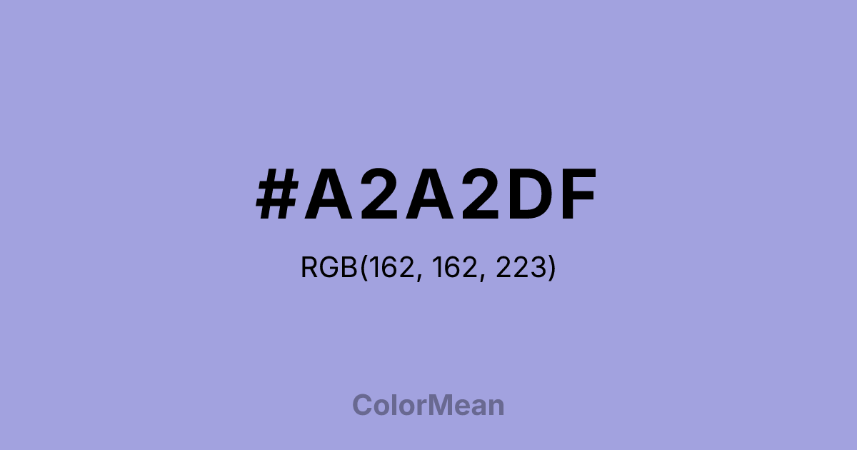#A2A2DF RGB value is (162, 162, 223). The hex color red value is 162, green is 162, and blue is 223. Its HSL format shows a hue of 240°, saturation of 49 percent, and lightness of 75 percent. The CMYK process values are 27 percent, 27 percent, 0 percent, 13 percent.