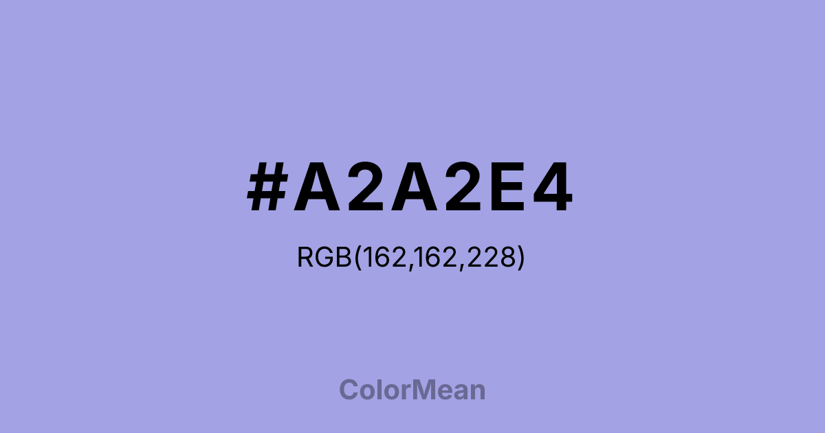 #A2A2E4 RGB value is (162, 162, 228). The hex color red value is 162, green is 162, and blue is 228. Its HSL format shows a hue of 240°, saturation of 55 percent, and lightness of 76 percent. The CMYK process values are 29 percent, 29 percent, 0 percent, 11 percent.