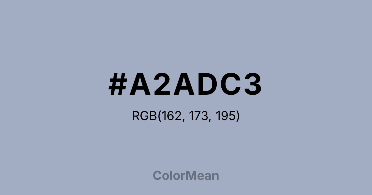 #A2ADC3 RGB value is (162, 173, 195). The hex color red value is 162, green is 173, and blue is 195. Its HSL format shows a hue of 220°, saturation of 22 percent, and lightness of 70 percent. The CMYK process values are 17 percent, 11 percent, 0 percent, 24 percent.