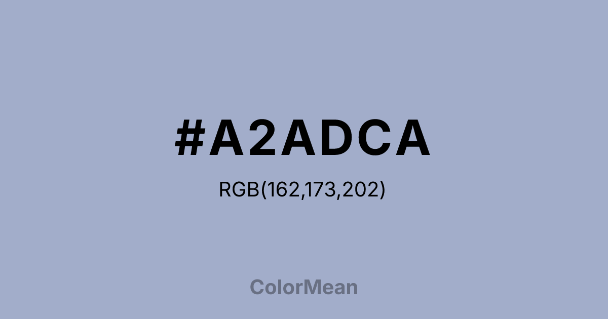 #A2ADCA RGB value is (162, 173, 202). The hex color red value is 162, green is 173, and blue is 202. Its HSL format shows a hue of 223°, saturation of 27 percent, and lightness of 71 percent. The CMYK process values are 20 percent, 14 percent, 0 percent, 21 percent.