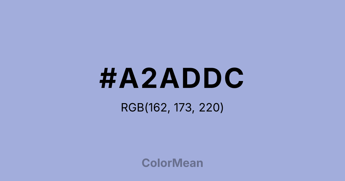 #A2ADDC RGB value is (162, 173, 220). The hex color red value is 162, green is 173, and blue is 220. Its HSL format shows a hue of 229°, saturation of 45 percent, and lightness of 75 percent. The CMYK process values are 26 percent, 21 percent, 0 percent, 14 percent.