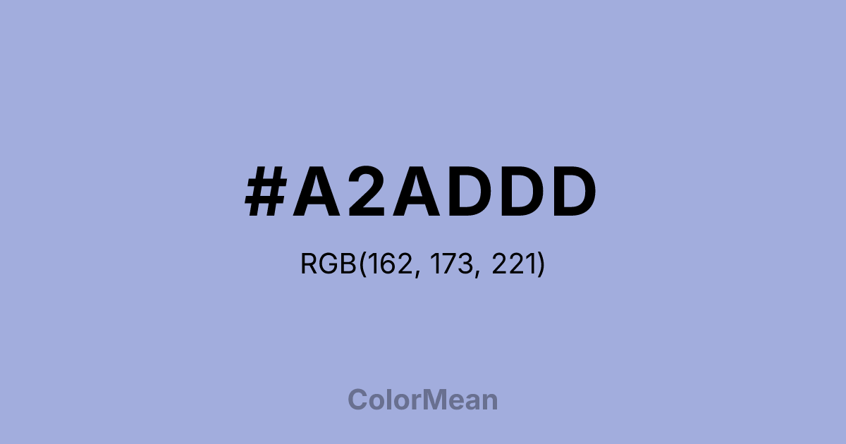 #A2ADDD RGB value is (162, 173, 221). The hex color red value is 162, green is 173, and blue is 221. Its HSL format shows a hue of 229°, saturation of 46 percent, and lightness of 75 percent. The CMYK process values are 27 percent, 22 percent, 0 percent, 13 percent.
