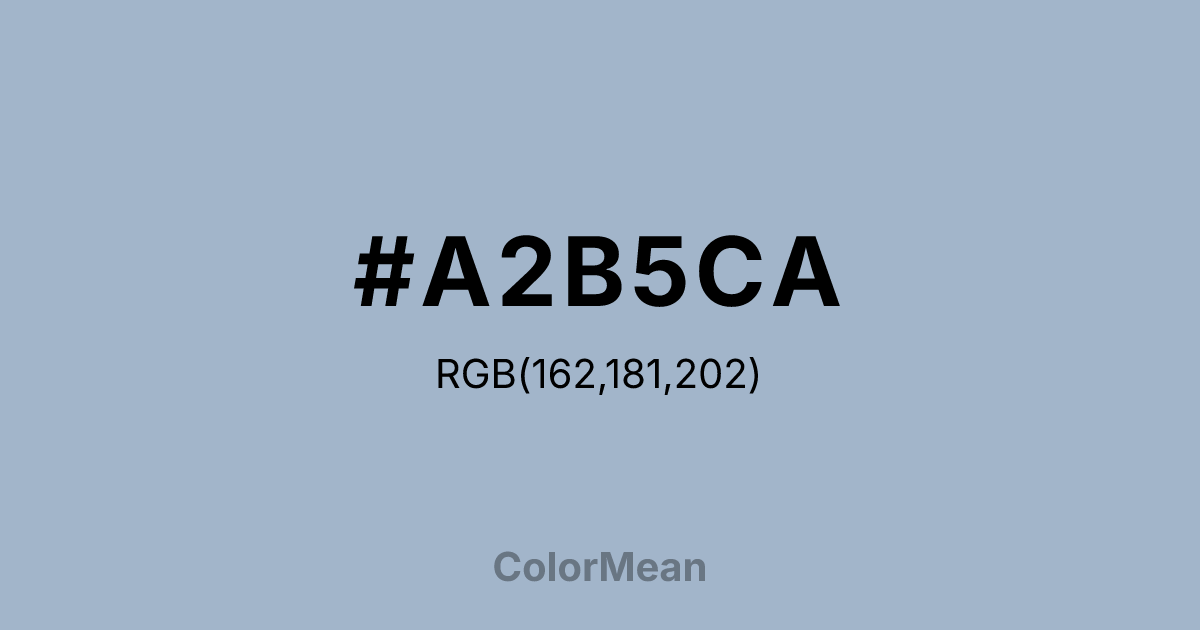#A2B5CA RGB value is (162, 181, 202). The hex color red value is 162, green is 181, and blue is 202. Its HSL format shows a hue of 211°, saturation of 27 percent, and lightness of 71 percent. The CMYK process values are 20 percent, 10 percent, 0 percent, 21 percent.